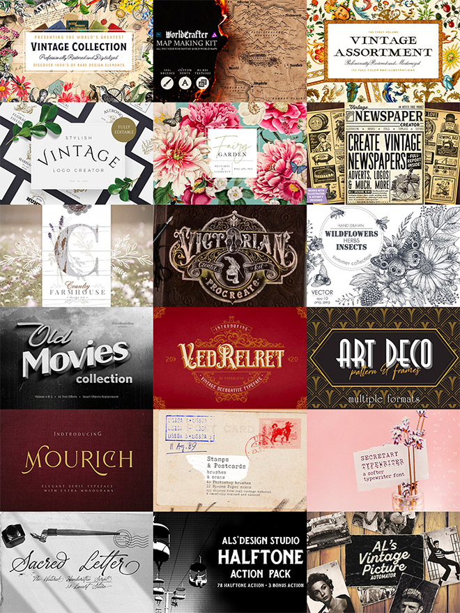 Every one of these 12 bundles contains a great variety of products, but here are my top pickings you might want to check out. These bundles are among the highest value of all deals being re-run and feature some of the best fonts, mockups, and vintage resources that will prove useful time and time again throughout your design career.