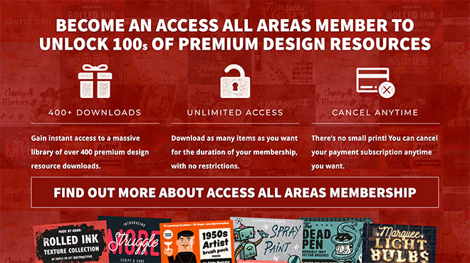 If you have found value from my tutorials or downloads over the years and would like to help support Spoon Graphics, please consider becoming an Access All Areas member. Many YouTubers use Patreon as a means for their subscribers to support their work, but the Access All Areas membership provides much more value with $5000 worth of premium design resource products, plus all future releases from myself and other talented creators that I partner with.
