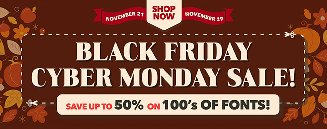 Save up to 50% on 100s of fonts at MyFonts as part of their Black Friday Cyber Monday Extravaganza! Be sure to check back daily for a new bonus offer, including free fonts and new foundry-wide discounts.