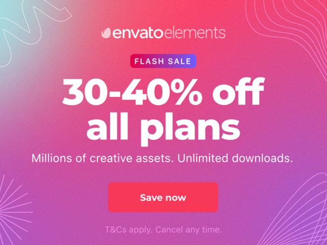 Envato Elements is currently running a rare flash sale of 30-40% off all their membership plans. Gain access to one of the largest libraries of creative assets and get unlimited downloads of graphics, templates, fonts, brushes, actions and even royalty free music and video!
