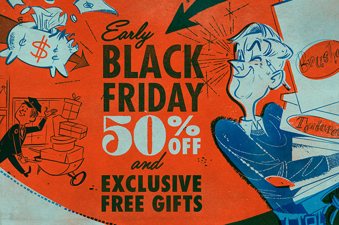 Be the first to grab some mega Black Friday deals this year with 50% off almost everything at RetroSupply. You can even unlock free gifts when you spend over $50, $100, or $200! This sale includes their best brushes, textures, and fonts for Procreate, Photoshop, Illustrator, Affinity and Clip Studio.