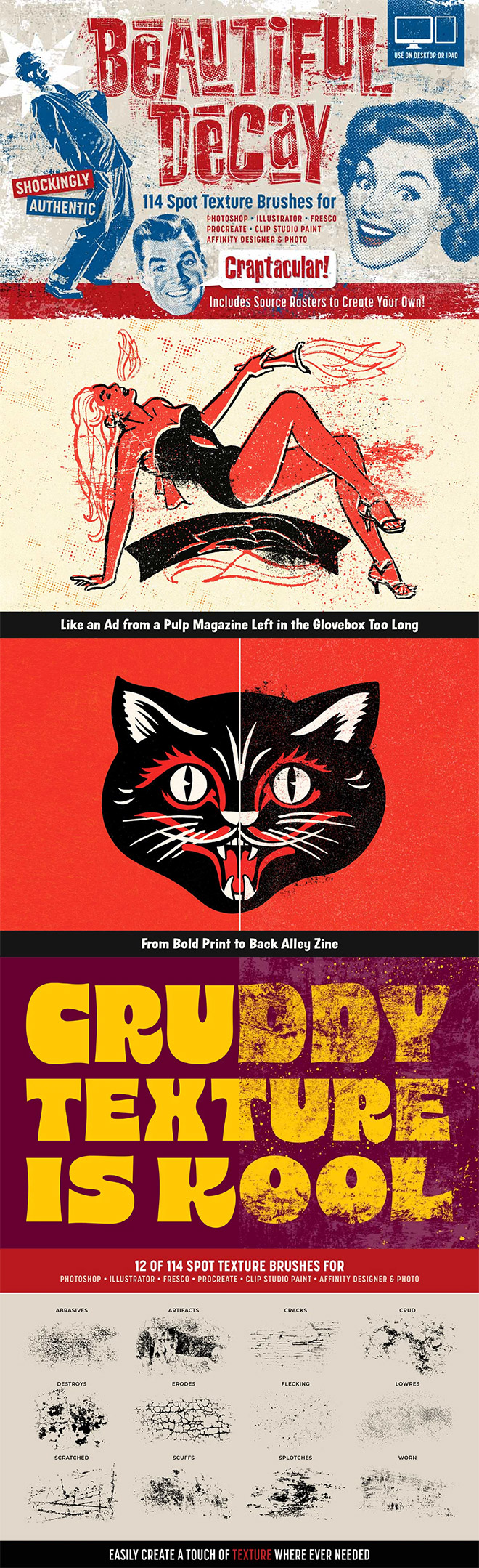 Beautiful Decay is the latest release over at RetroSupply, handcrafted by legendary designer Von Glitschka. This pack of 114 high-impact spot texture brushes is built to wreck your digital perfection – in the best way