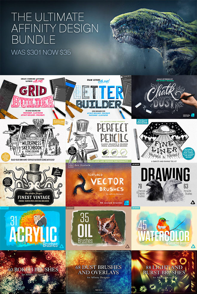This bundle includes popular products from the greatest designers in the Affinity universe – all for a massive 88% discount! These tools are guaranteed to level up your work! Whether you’re into photo manipulation, digital painting, lettering, brand work or illustration, this bundle has you covered. Breathe new life into your Affinity projects with these professional design tools. This huge discount is only available for 3 weeks, after that the