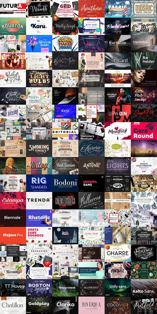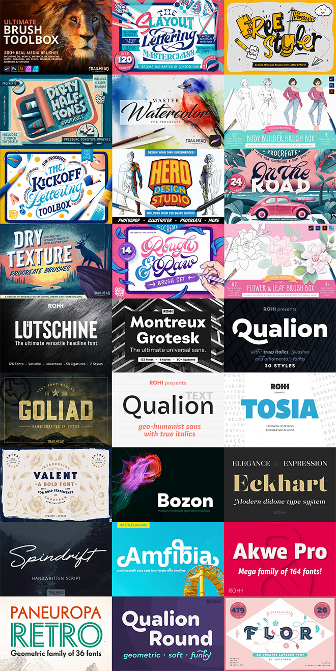 Delve through these huge collections of design resources and pick up as many as you can to benefit from the insane discounts! Every one of these 28 bundles contains a great variety of products, featuring some of the best fonts, mockups, illustration kits, Procreate brushes, vector graphics, and more! These tools will prove useful time and time again throughout your whole design career.