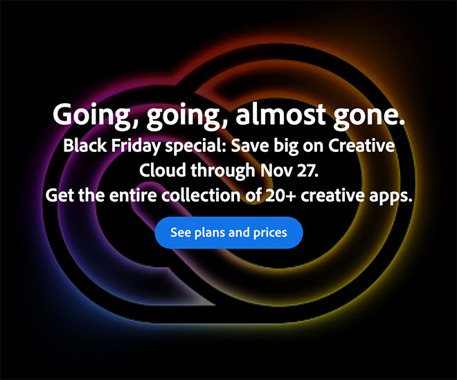 New users can benefit from 25% off the entire collection of 20+ Adobe Creative Cloud apps, including Photoshop, Illustrator, Lightroom, and more. Offer ends Nov 27th.