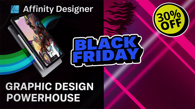 Save 30% on Affinity Designer, Affinity Photo, Affinity Publisher, and all other content within the Affinity store, including T-shirts, workbooks, and toolkits.