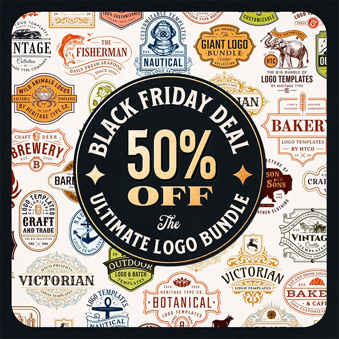 Get a gigantic collection of 200 editable vector logo templates in a variety of vintage design styles for half price from Heritage Type. Offer ends Nov 28th.